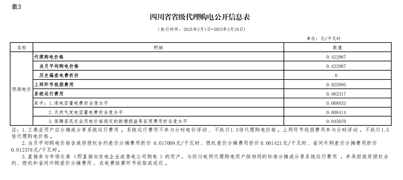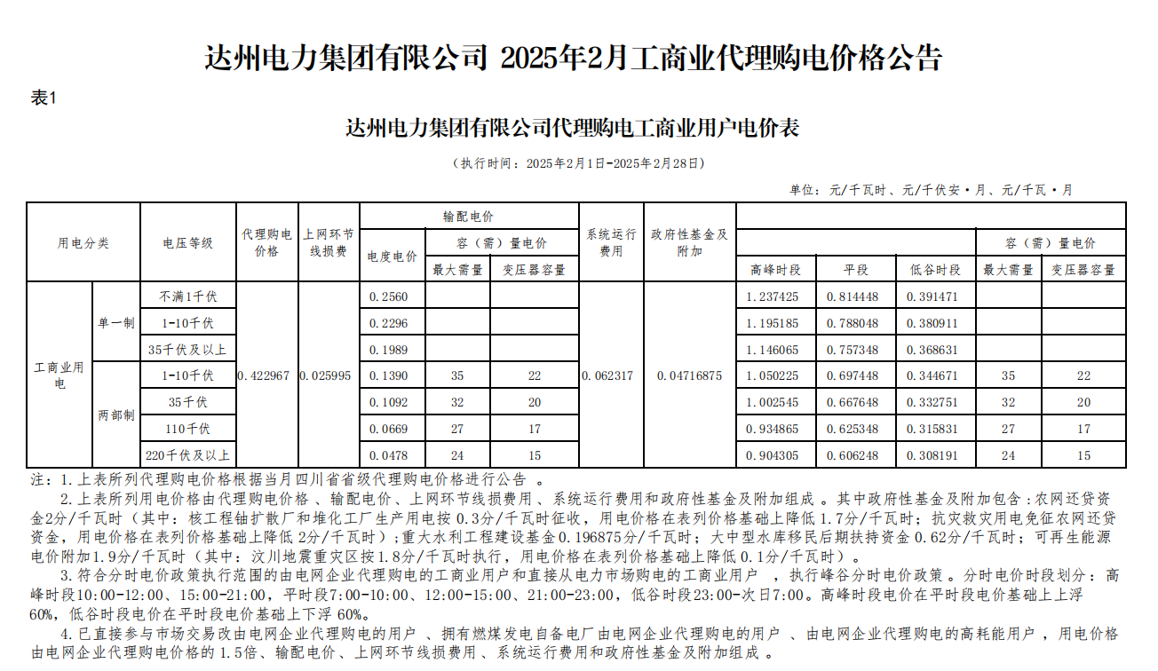 永利集团88304官网有限公司2025年2月工商业代理购电价格公告