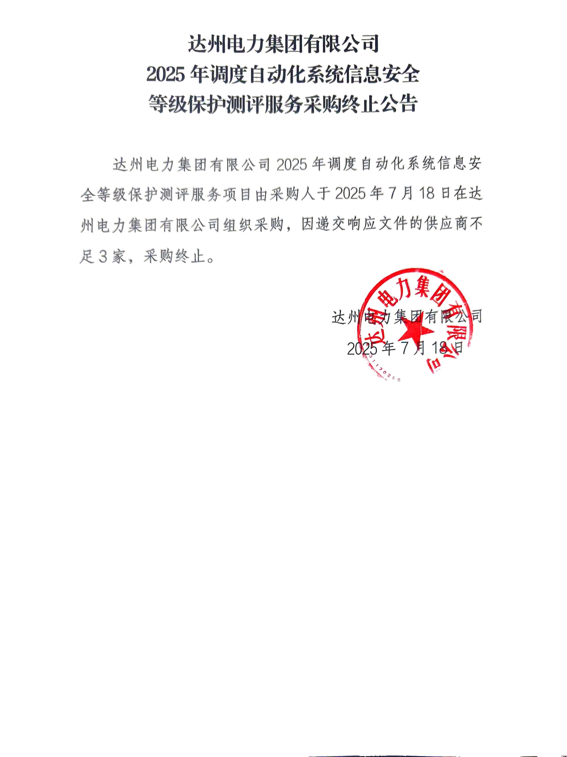 永利集团88304官网有限公司2025年调度自动化系统信息安全等级保护测评服务采购终止公告