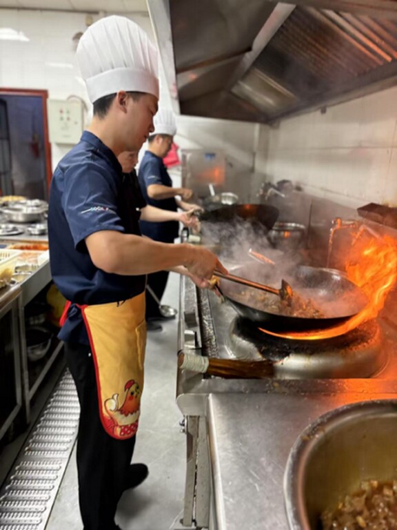盛夏的食堂后厨,炉灶热浪与酷暑高温叠加,俨然一座“火焰山”。然而,厨师们的身影从未停歇——厨师唐静高帽紧扣,围裙系牢,在弥漫的油烟中精准掌控火候,快速翻炒。汗珠不断从额角滚落,浸湿衣衫,他们却无暇擦拭。
