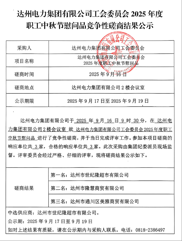 永利集团88304官网有限公司工会委员会2025年职工中秋节慰问品竞争性磋商结果公示