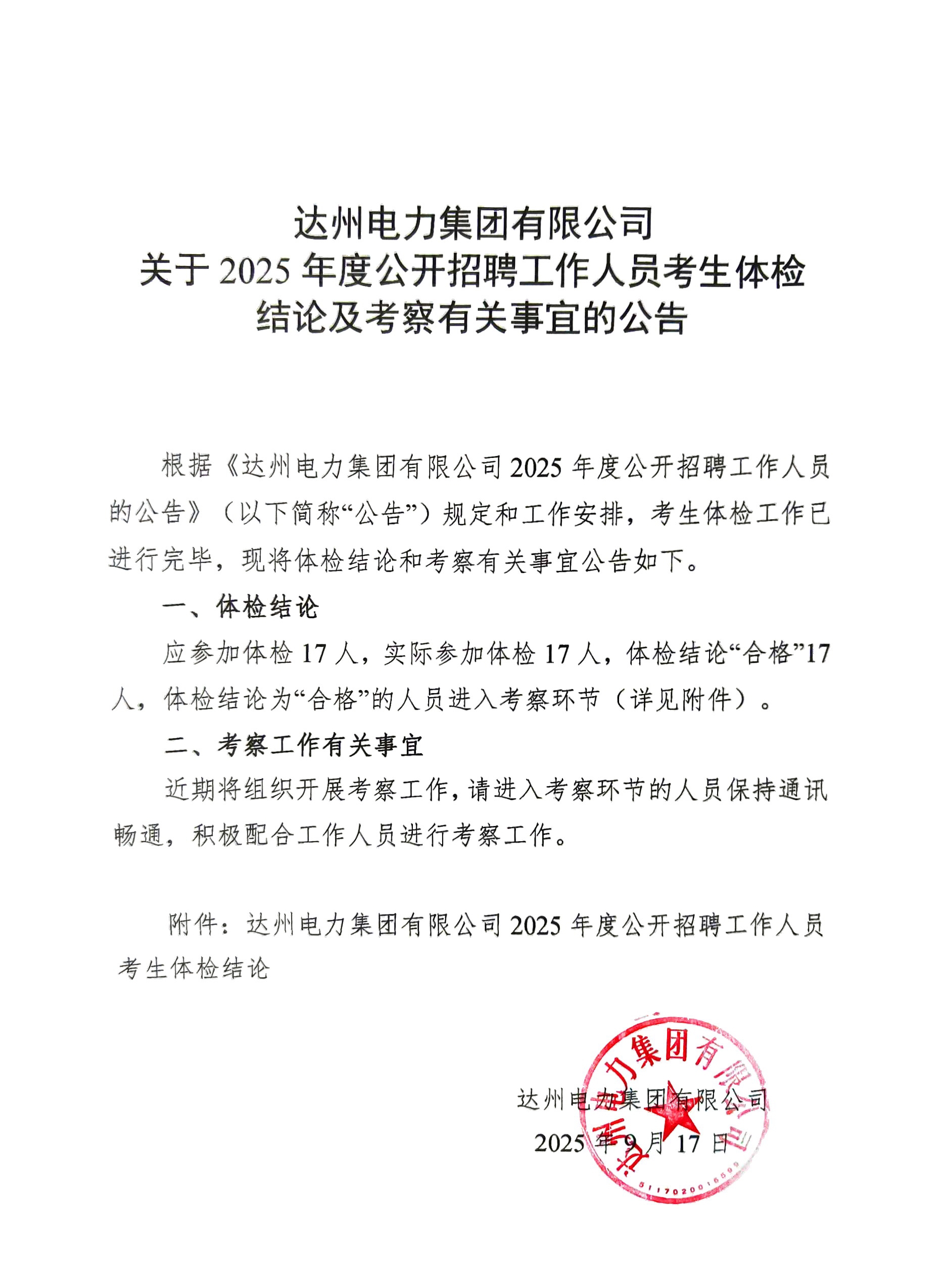 附件:永利集团88304官网有限公司2025年度公开招聘工作人员考生体检结论