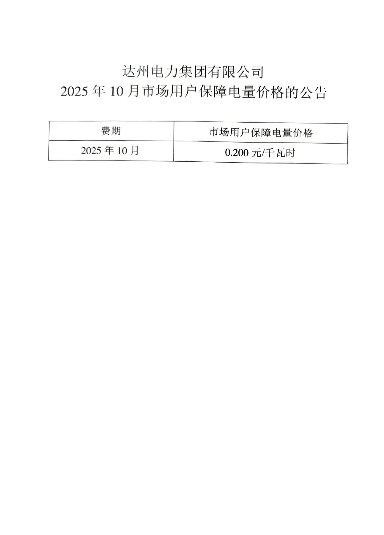 永利集团88304官网有限公司2025年10月市场用户保障电量价格的公告