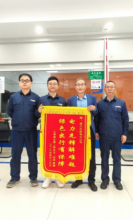 春风和煦,暖意盈心。4月15日,一面印有“电力先锋解难题,绿色出行有保障”的鲜红锦旗,被送至永利集团88304官网有限公司通川区供电分公司,这是江湾城五期业主对我司新能源供电服务的由衷赞誉,更是企业紧跟时代步伐、践行绿色发展使命的生动见证。